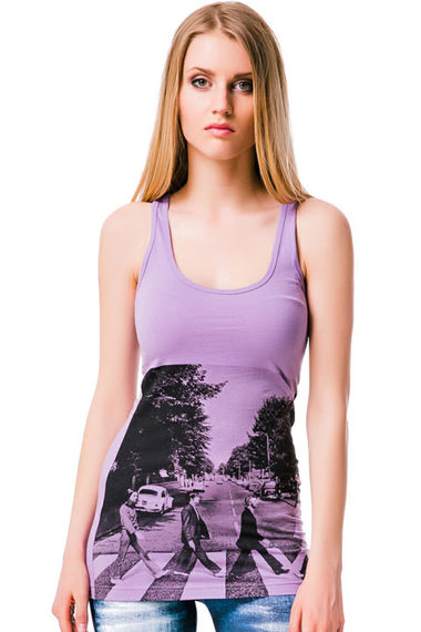 Стильная фиолетовая майка удлиненного силуэта. Впереди украшена принтом с изображением легендарной группы "The Beatles".